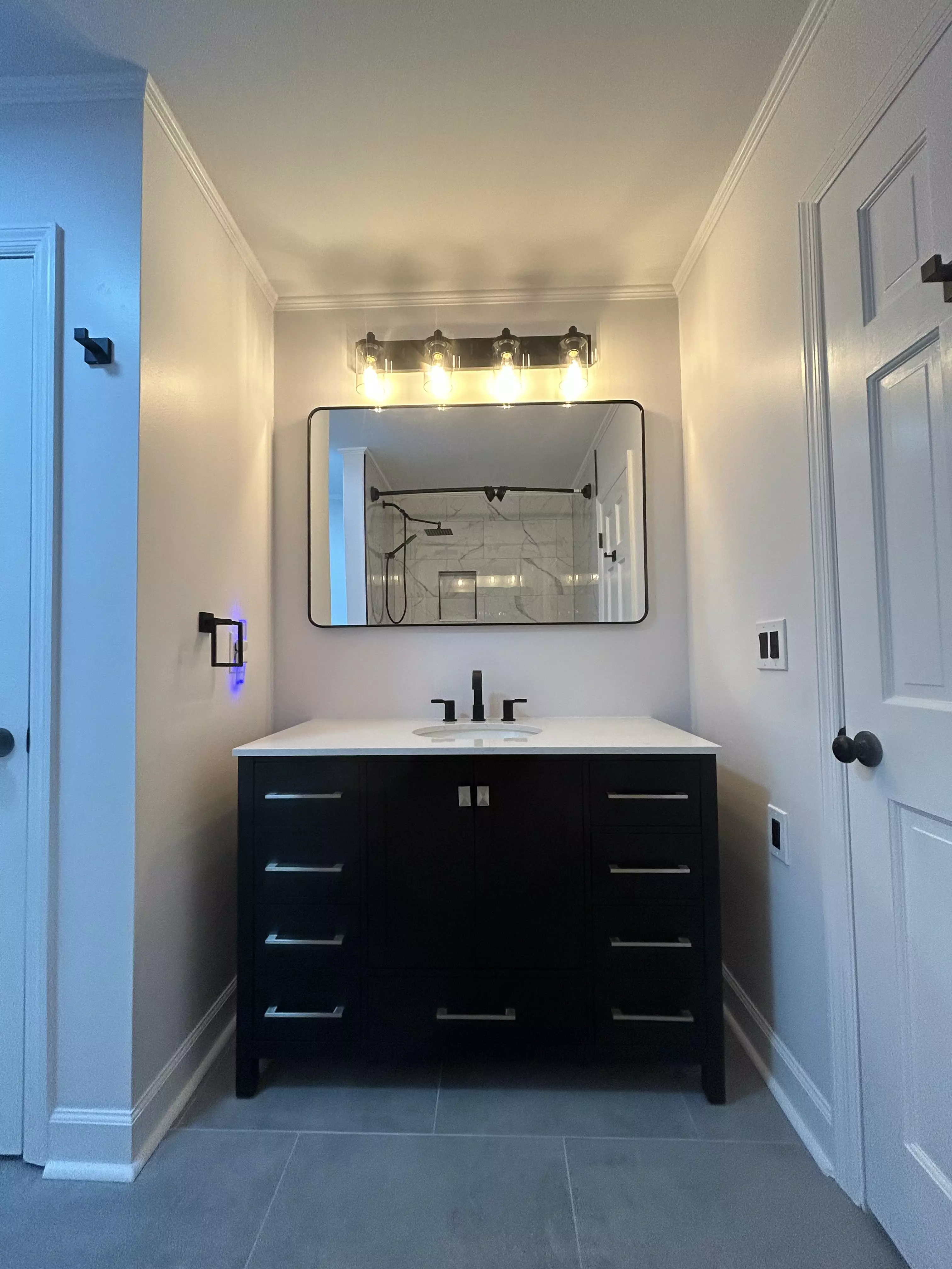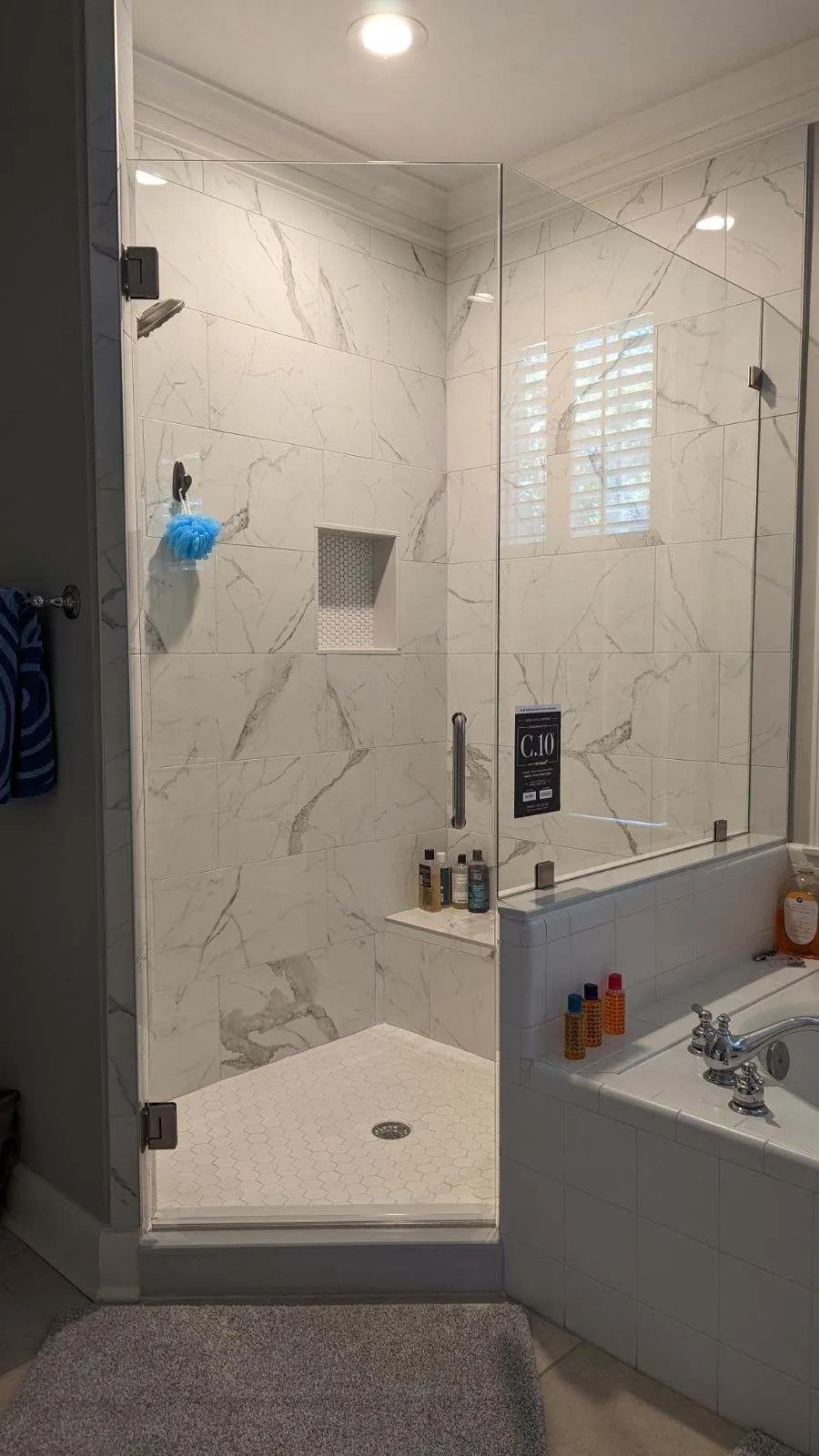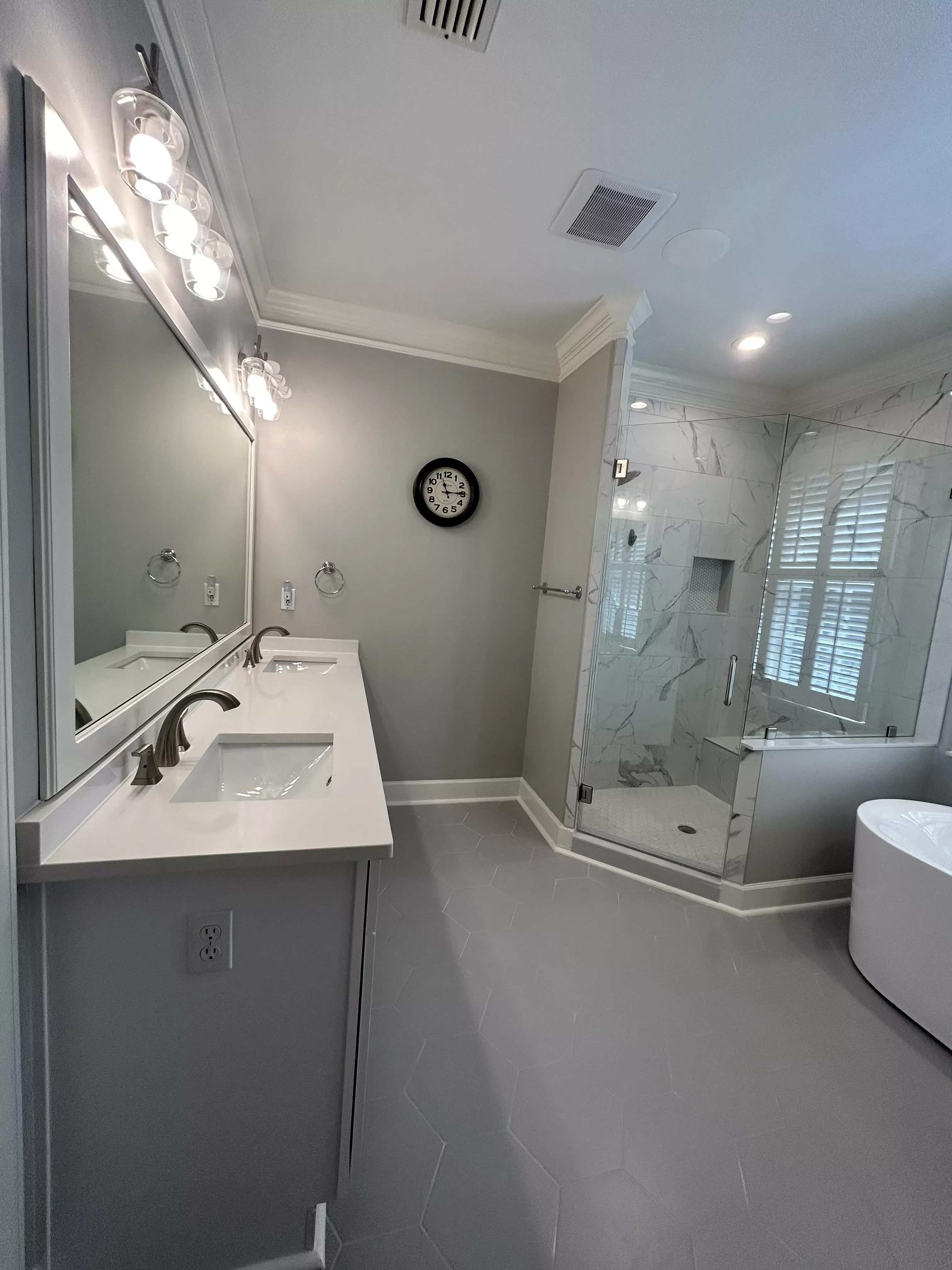 Bathroom Upgrade: This space now boasts a luxurious freestanding tub, a spacious walk-in shower with elegant marble tile, and sleek glass doors for a modern touch. The new vanity and contemporary lighting fixtures complete the spa-like retreat that’s perfect for relaxation.